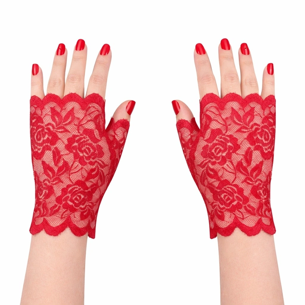 Zarif ve dikkat çekici tasarımıyla öne çıkan kırmızı gül desenli dantel parmaksız eldiven, özel günler, parti organizasyonları ve kostüm kombinleri için ideal bir aksesuardır. İnce dantel dokusu ve gül desenli tasarımı ürüne estetik ve şık bir görünüm kazandırır.