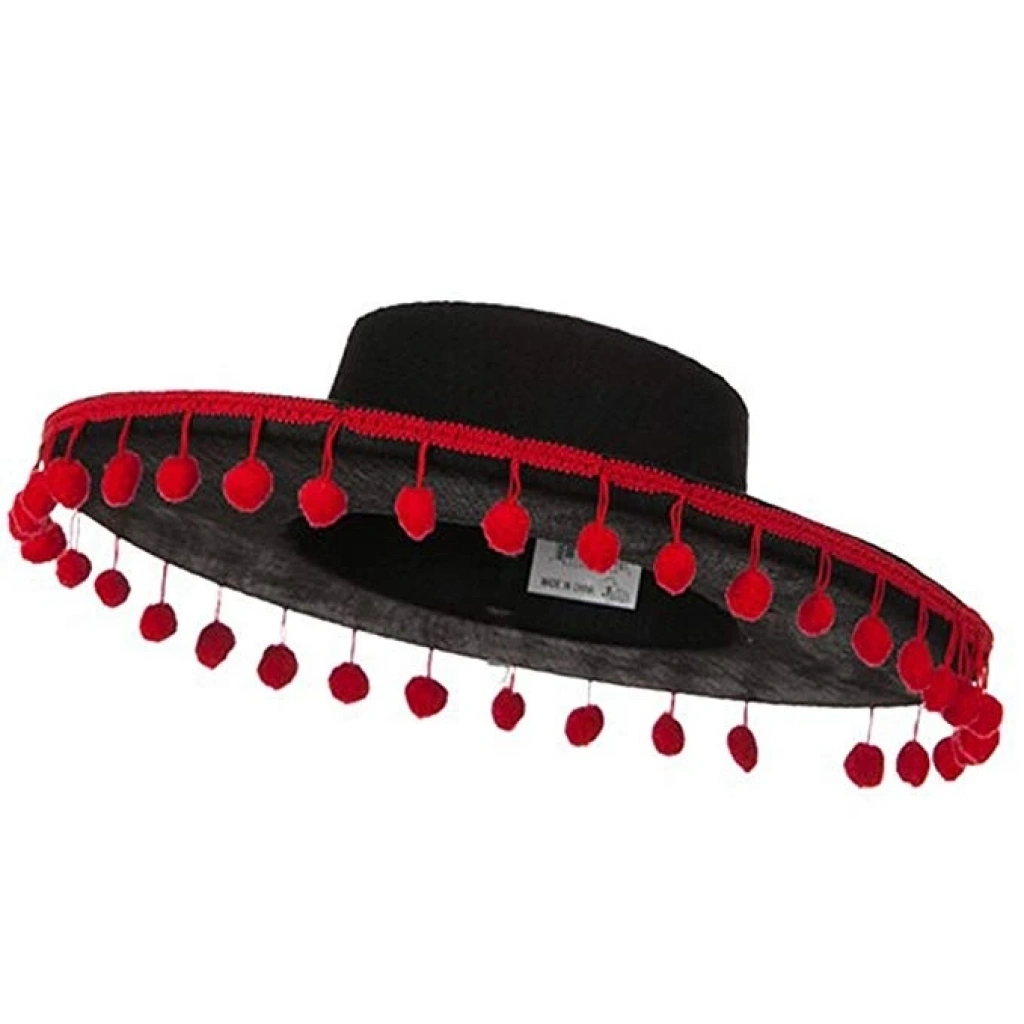 Kırmızı Ponponlu Siyah Renk Çocuk İspanyol Şapkası