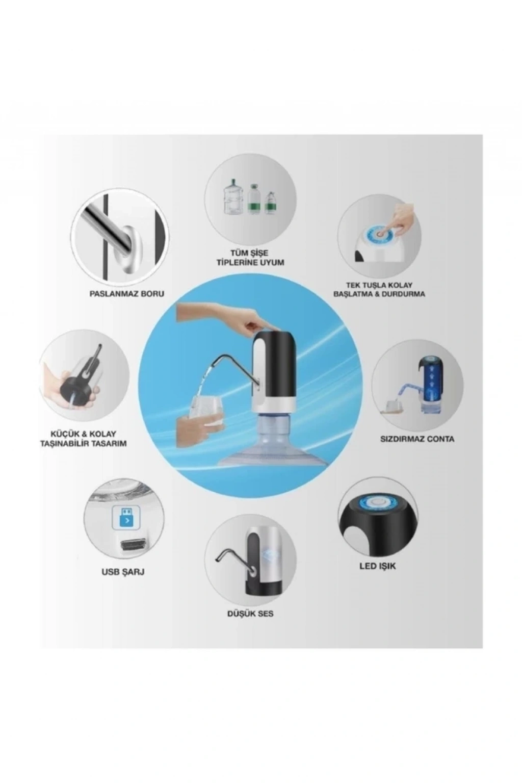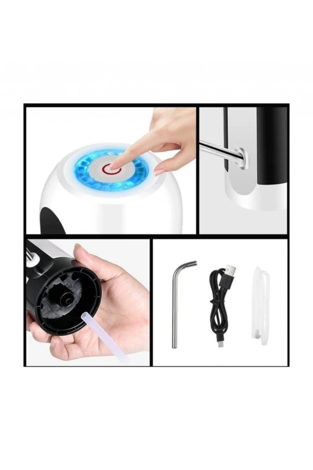 1 Otomatik Su Pompası Gövdesi 2 Paslanmaz Çelik Pompa Ucu 3 Micro USB Şarj Kablosu